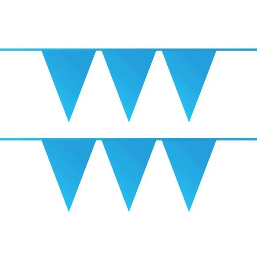 Stevige vlaggetjes slinger in de kleur midden blauw gemaakt van plastic. De lengte van deze blauwe vlaggenlijn is 10 meter. De vlaggetjes aan de vlaggenlijn zijn 20×30 cm en er zitten 20 vlaggetjes op een lijn.